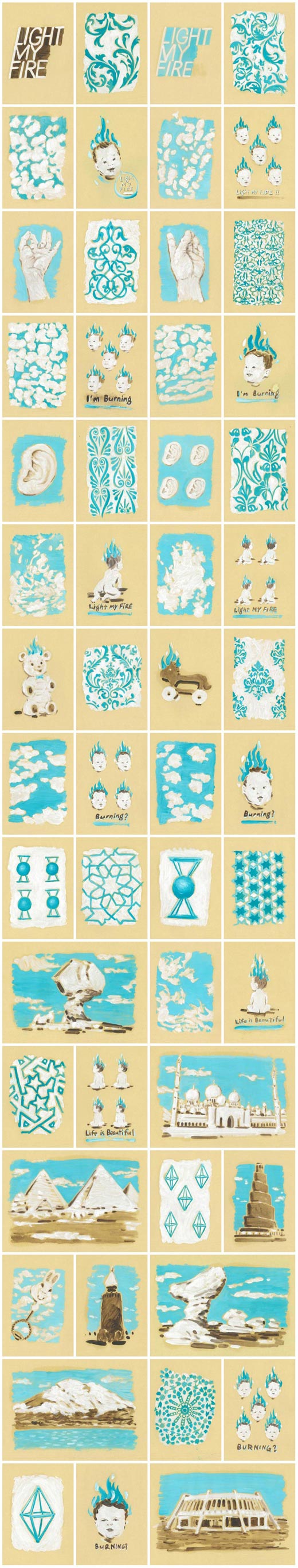 イメージ:頭部の燃えている赤ん坊、アラベスク、雲、肉体、抽象的物体、塔、アラブの風景